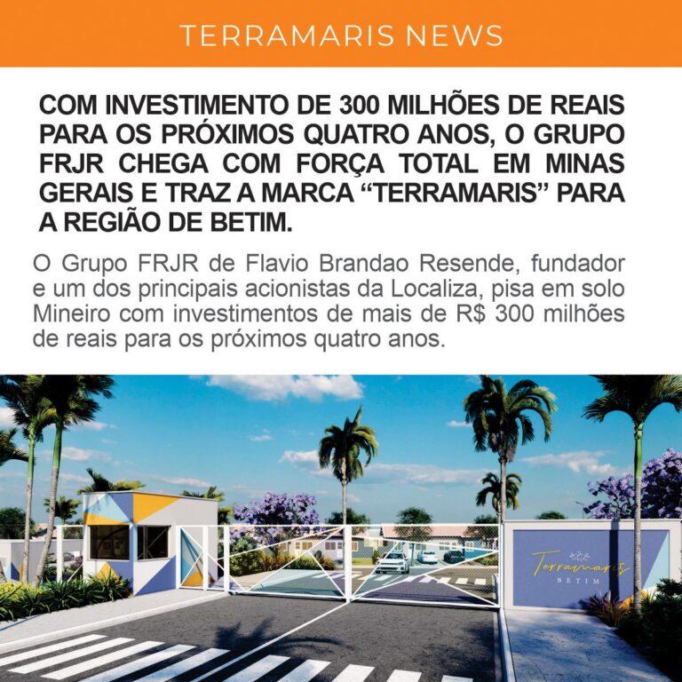 Com investimento de 300 milhões de reais, o grupo FRJR chega com força total em Minas Gerais e traz a marca “Terramaris” para a região de Betim. O Grupo FRJR de Flavio Brandao Resende, fundador e um dos principais acionistas da Localiza, pisa em solo Mineiro com investimentos de mais...